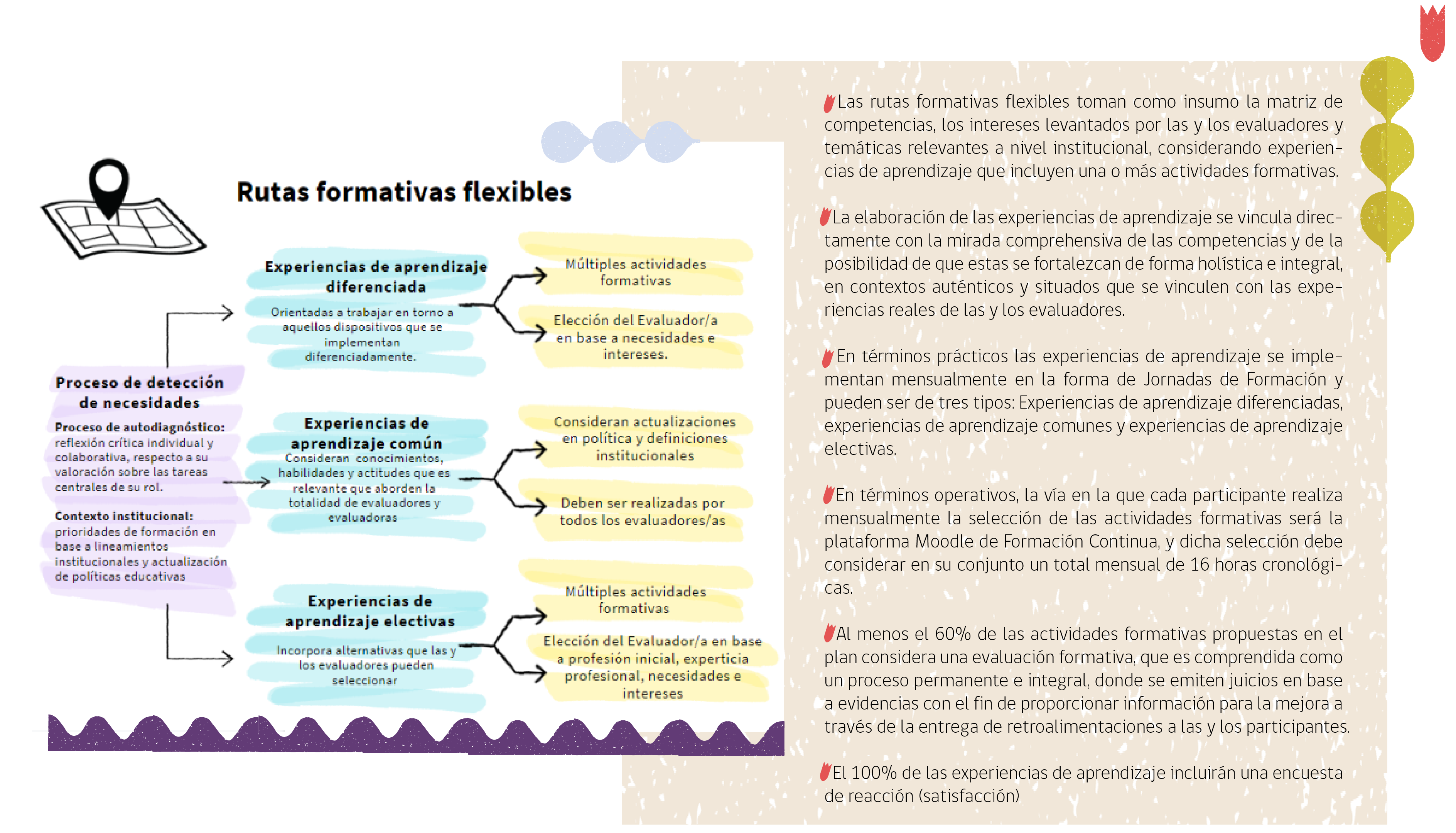 flexibles toman como insumo la matriz de competencias, los intereses levantados por las y los evaluadores y temáticas relevantes a nivel institucional, considerando experiencias de aprendizaje que incluyen una o más actividades formativas. - La elaboración